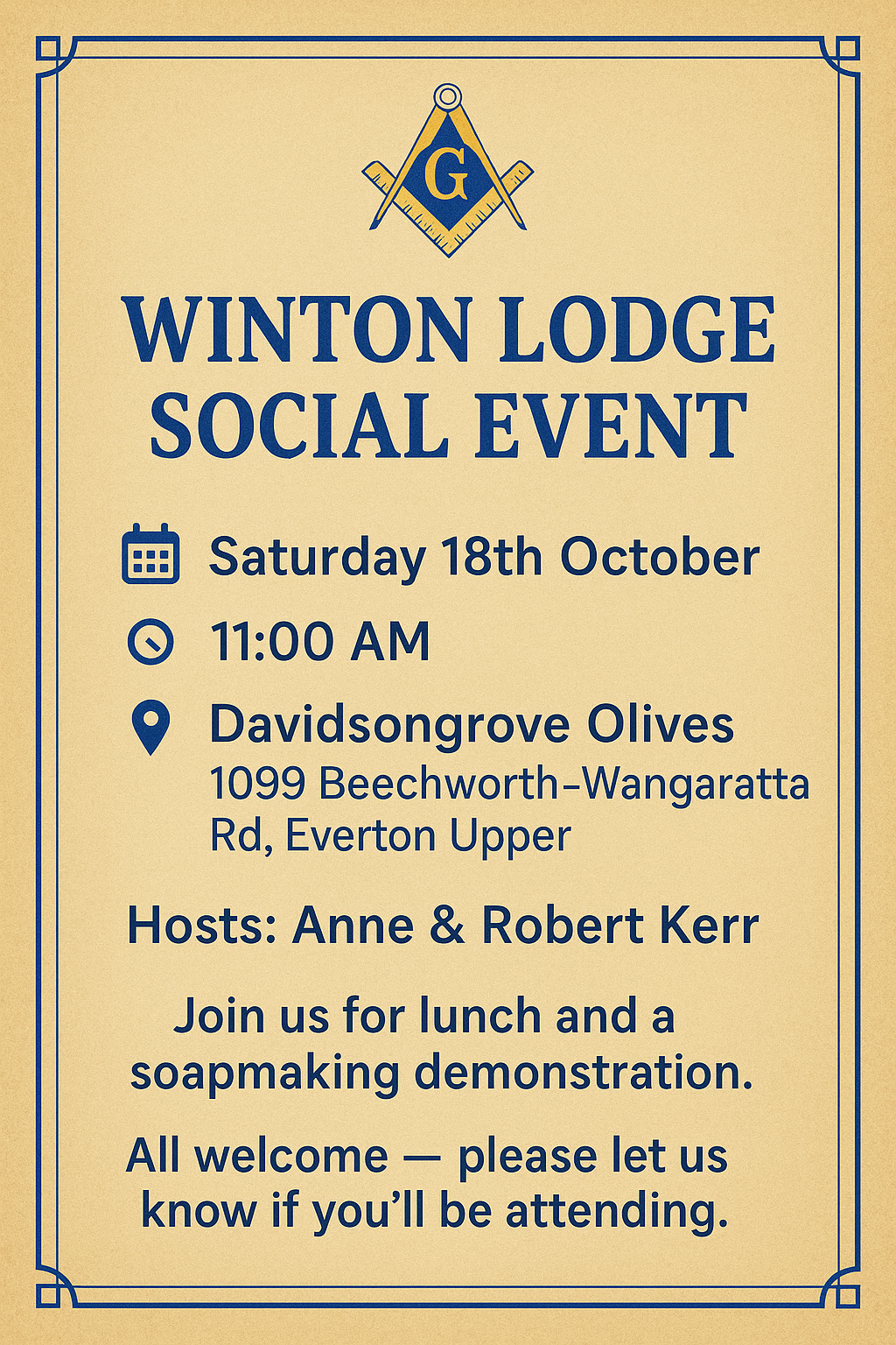 Meet the new team members of Winton Lodge! Our Installation took place on Saturday, 26th July, in Tallangatta, and it was a fantastic day and night. Wor Bro Arthur Willison was installed as Master by RT Wor Bro Barry Minster PDGM, with Wor Bro Reg Cooke assisting as Proclaiming Officer.